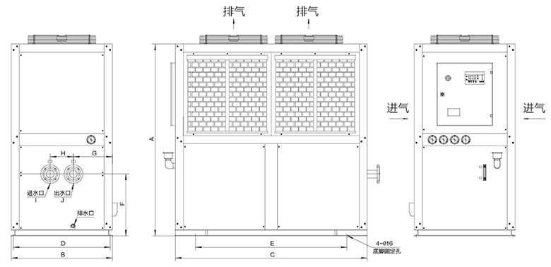 3.冷水機安裝時,進風口需預(yù)留≮ 100cm的空間,出風口預(yù)留≮300cm的空間;