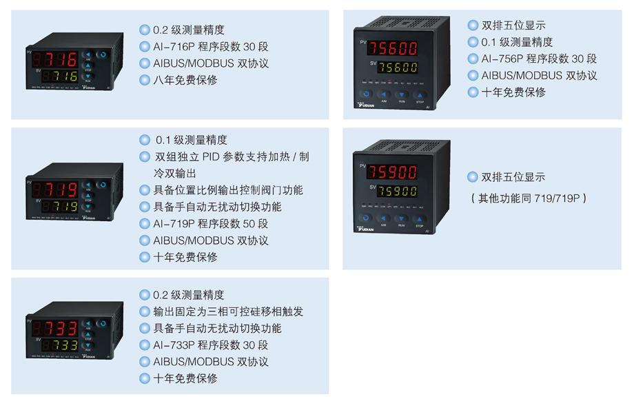 AI系列高性能人工智能溫度控制器/調(diào)節(jié)器——穩(wěn)定、功能強大、環(huán)保節(jié)能的人工智能溫度控制器/調(diào)節(jié)器,適用于節(jié)能環(huán)保及控制精度要求高的用戶。除具備通用型儀表的所有功能外,儀表還可以直接實現(xiàn)三相三線移相觸發(fā)輸出(AI-733/719 型)及位置比例輸出控制閥門電機正/反轉(zhuǎn)、組成串級或比例調(diào)節(jié)復(fù)雜系統(tǒng)等豐富功能(AI-719/759 型)。